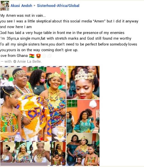A newly married Ghanaian single mother, Akasi Andoh took to a prayer group on Facebook to share her testimony after getting married.